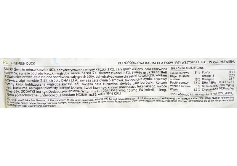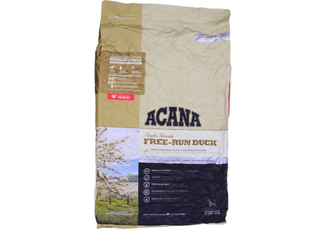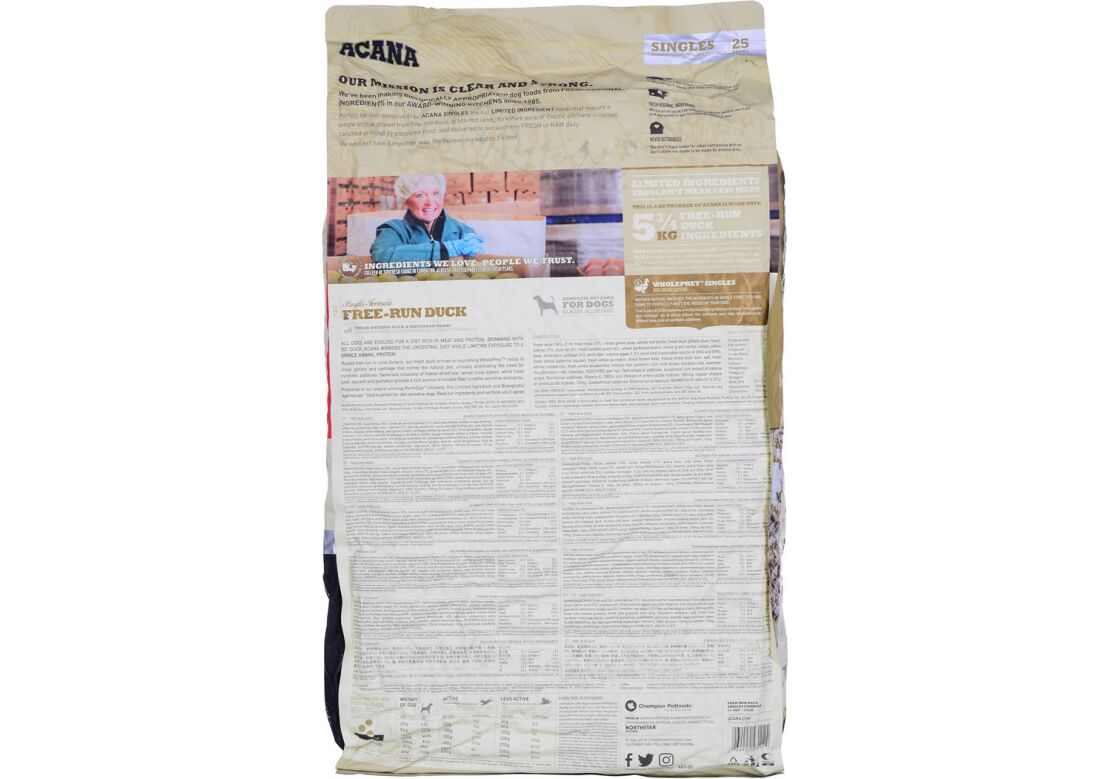 | Pet food composition | Fresh duck meat (18%), dehydrated duck meat (17%), whole green peas, whole red lentils, fresh duck organs (liver, heart, kidneys) (7%), duck fat (6%), fresh bartlett pears (4%), whole chickpeas, whole green lentils, whole yellow peas, dehydrated duck cartilage (2%), lentil fibre, marine algae (source of DHA and EPA) (1. 2%), fresh whole musk pumpkin, fresh whole pumpkin, dried brown kelp, freeze-dried duck liver (0.1%), salt, fresh whole cranberries, fresh whole blueberries, chicory root, turmeric, milk thistle, burdock root, lavender blossom, horseradish root, rosehips. |