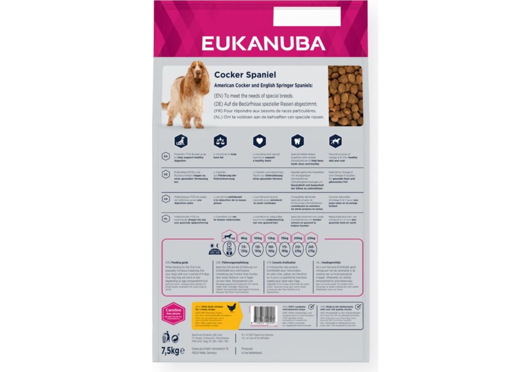 | Pet food composition | Dried Chicken And Turkey (29%, A Natural Source Of Taurine, Glucosamine And Chondroitin Sulphate), Maize, Wheat, Animal Fat, Sorghum, Barley, Dried Beet Pulp (2.9%), Hydrolysed Animal Proteins, Dried Whole Egg, Potassium Chloride, Sodium Chloride, Fish Oil, Sodium Hexametaphosphate, Calcium Carbonate, Fructooligosaccharides (0.38%), Linseed | | Pet food flavor | Chicken | | Weight | 7.5 kg | | Dog breed | Cocker Spaniel | | Includes vitamins | Vitamin D3 | | Breed size | Medium (11 - 25kg) | | Pet life stage | Adult | | Health effects | Cardiac, General health, Skin & coat | | Calcium | 1.35% | | Copper content | 60 mg/kg | | Vitamin D3 content | 1506 IU/kg | | Phosphorus | 1% | | L-carnitine content | 48.2 mg/kg | | Zinc content | 278 mg/kg | | Potassium content | 4.4% | | Vitamin E content | 252 mg/kg | | Vitamin A content | 45375 IU/kg | | Crude fibres | 2.6% | | Fat content | 12% | | Crude ash | 7.4% | | Protein | 27% | | Iron content | 799 mg/kg |